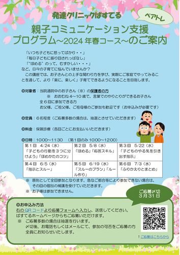 親子コミュニケーションプログラム(ペアレントトレーニング、ペアトレ)の春コースのご案内です。 今年度も、春と秋の2回、実施いたします。 1回90分程度の講座を全6回、約3か月かけてじっくりと学び身につけることができるコースです。 「つい怒って…